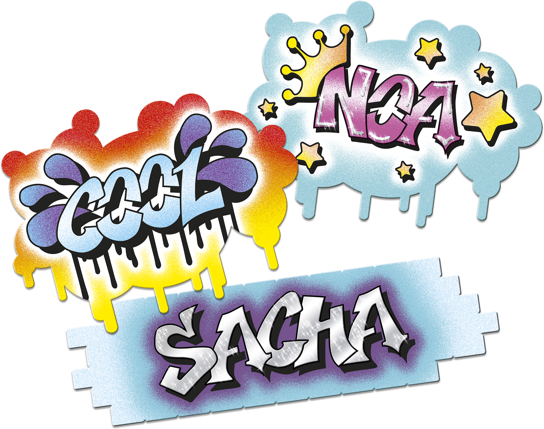 Ecris ton prénom, ton pseudo ou tout autre mot avec un style urbain. Tu as plus de 30 pochoirs et 6 Blopens pour styliser ta création avec un effet aérographe.