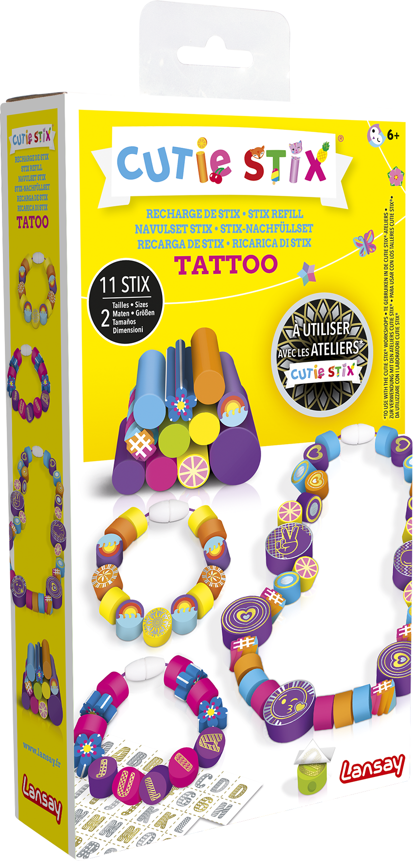 Continue de créer des bijoux Cutie Stix avec les recharges de stix sur des thèmes tendances : Happy, Cool, Magic, Pop et le tout dernier Tattoo !