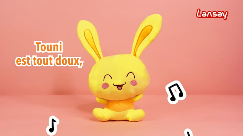 La douce peluche musicale Touni reproduit 5 comptines lorsqu'on appuie sur son ventre.